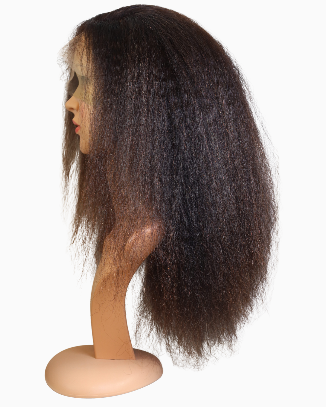 Voluminous 22” lace front wig with raw kinky blowout texture. Natural-looking, heat-friendly, and perfect for protective styling.